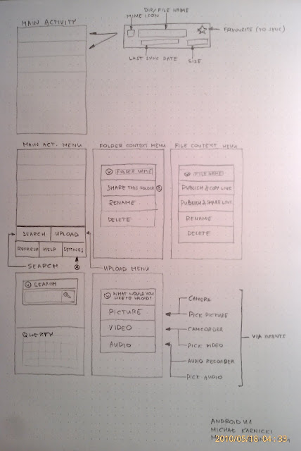 ReplyDeleteThanks :) ! You can find more brainstorm-like info related to your findings here: https://wiki.ubuntu.com/specs/UbuntuOneForAndroid whereas my regular proposal (so, the basic features that will be implemented first, can be found here: https://wiki.ubuntu.com/GSoC/2010/MichalKarnicki ). Based on the specs provided (see BoF agenda section) the app will first work in semi sync mode - sync only selected (favourite) files (preferably syncing on WIFI, which often is free opposed to 3G).
